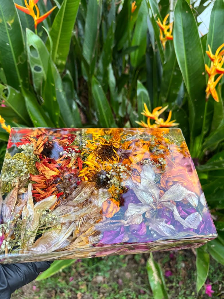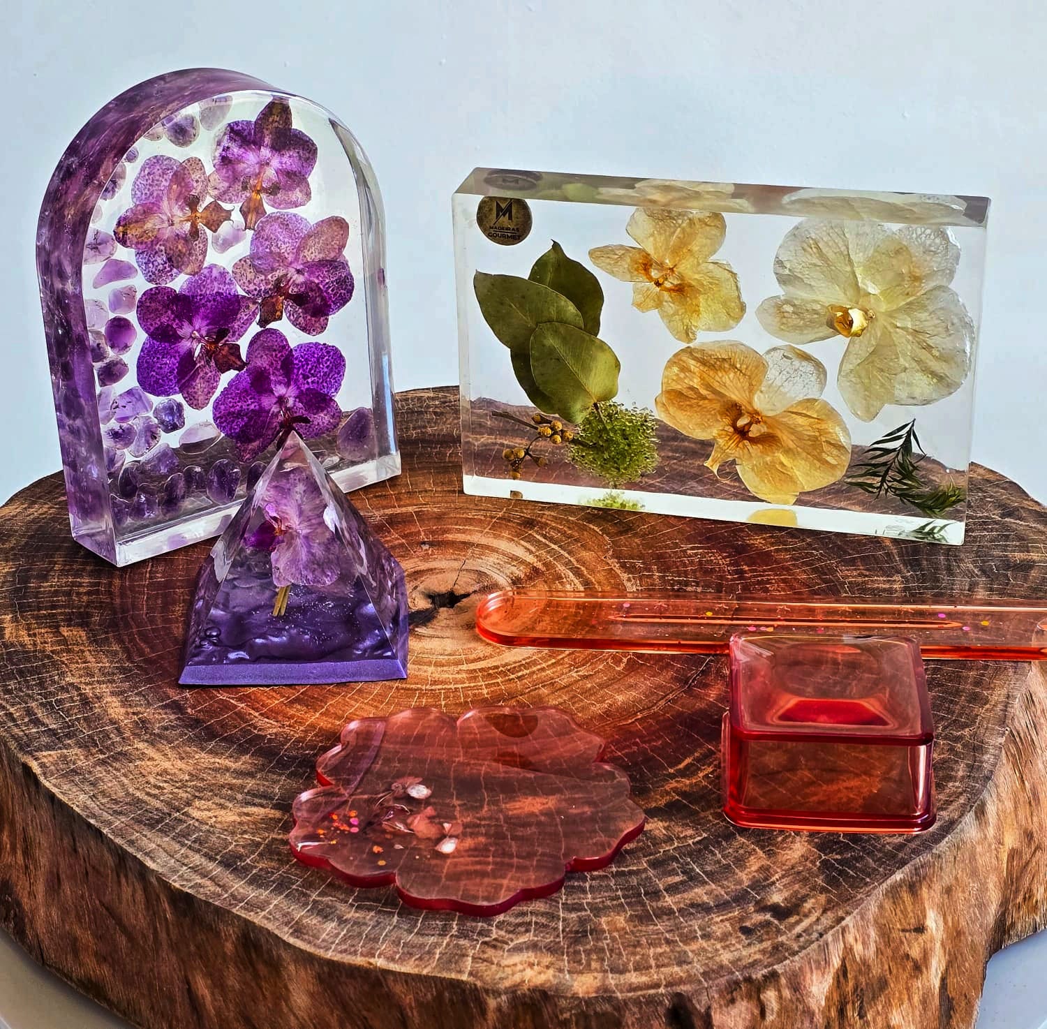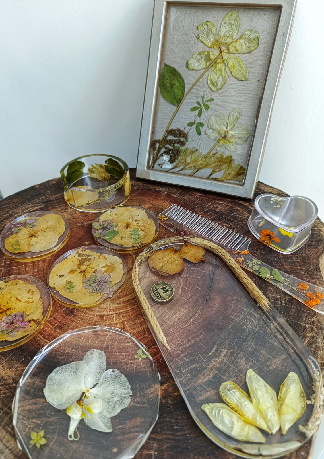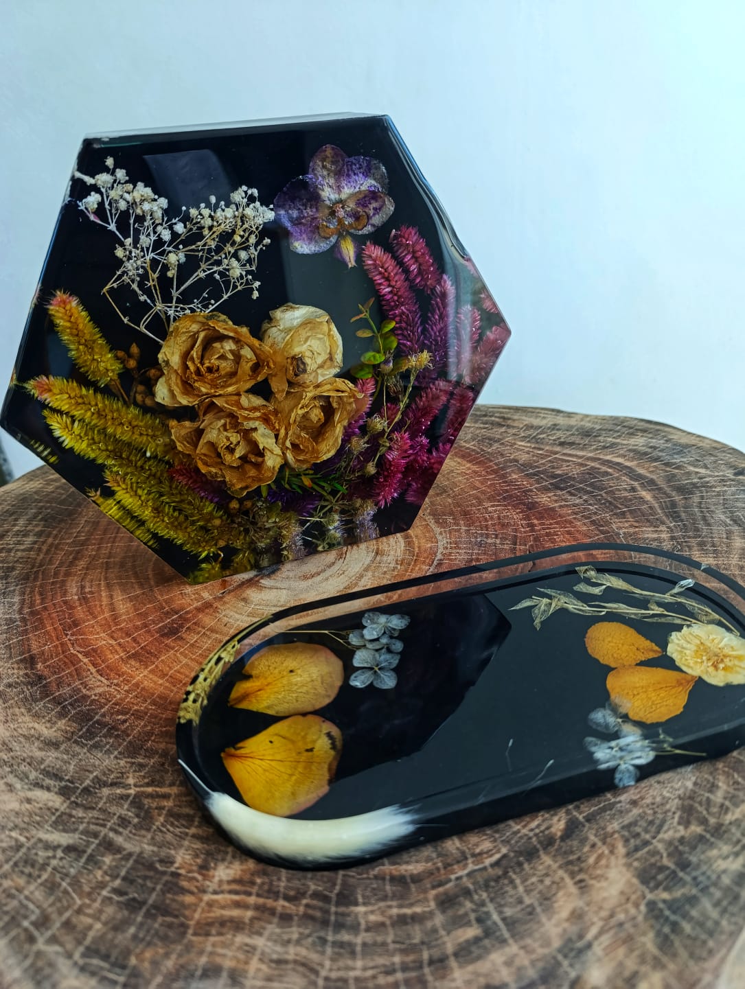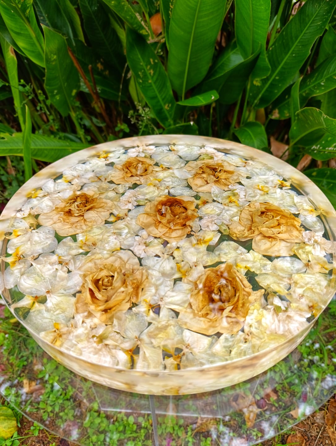 Mistura de Madeira Angelim Pedra com Resina UV e flores do buquê preservadas de acordo com o tipo de flor e folhagem para melhor se adequar as peças do conjunto 10, assim, o conjunto 10 pode ter efeito prensado na resina e 3D destrinchado na resina. O projeto será executado de acordo com o modelo de flor e folhagem em harmonia com as peças do conjunto.