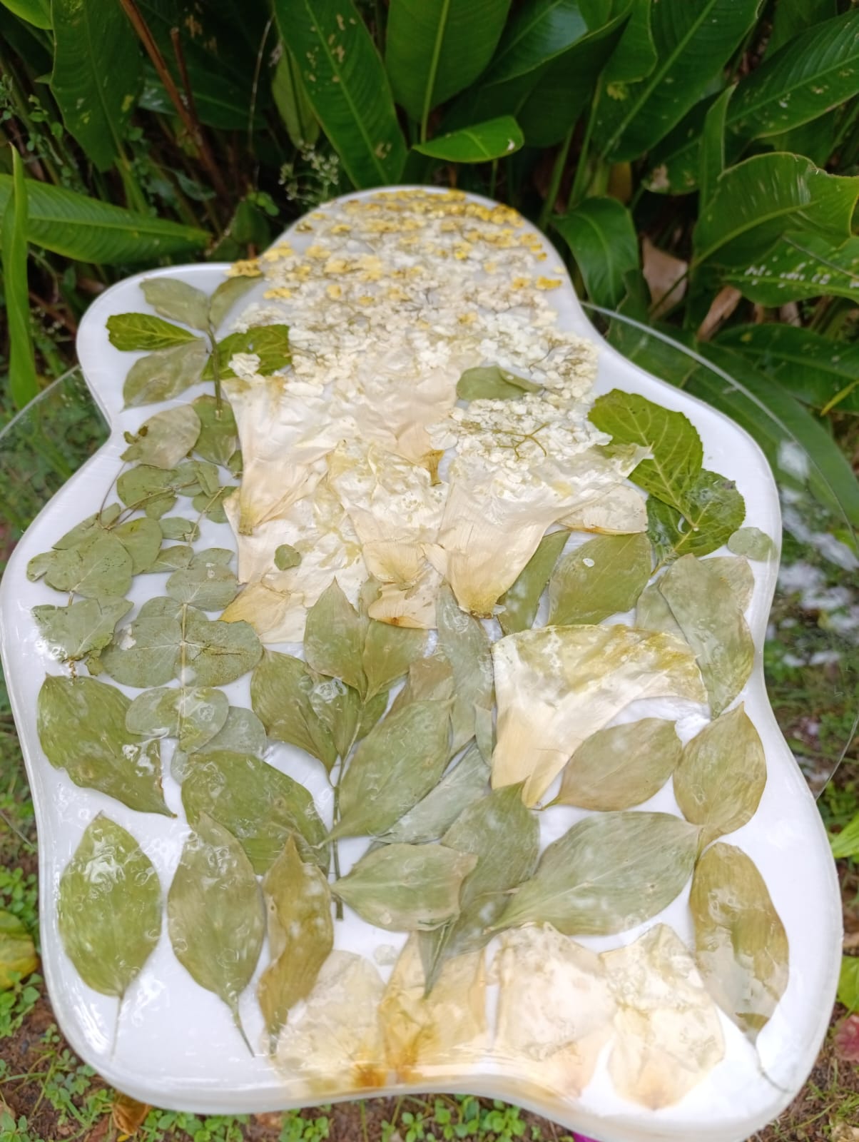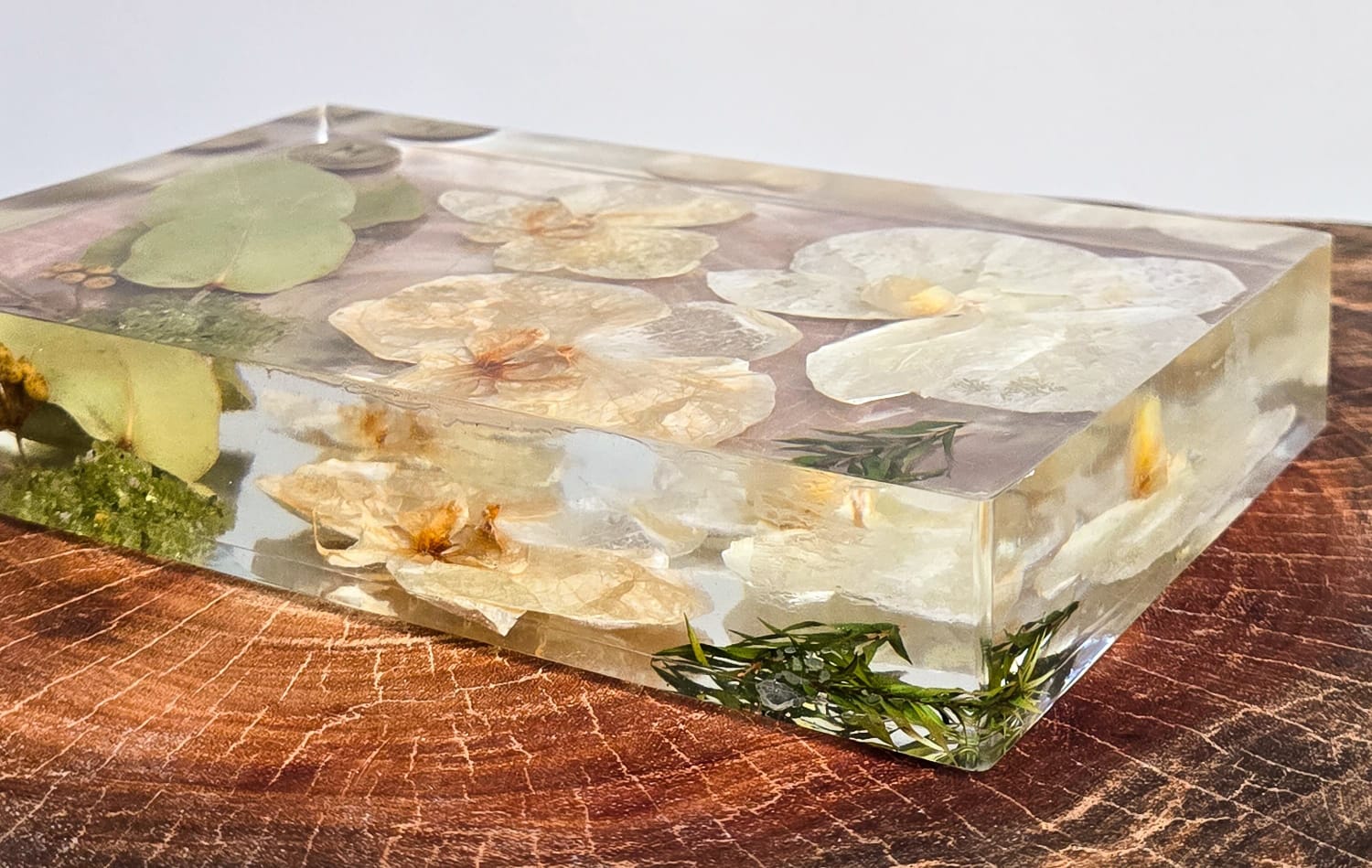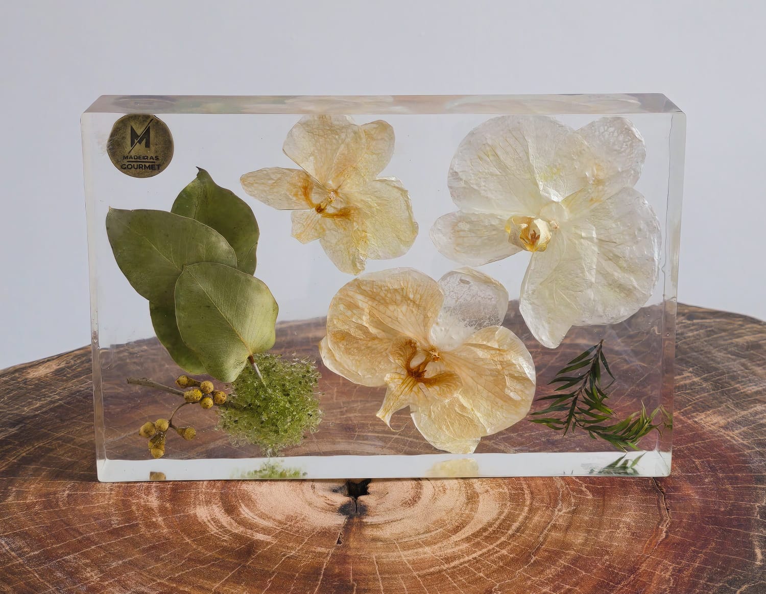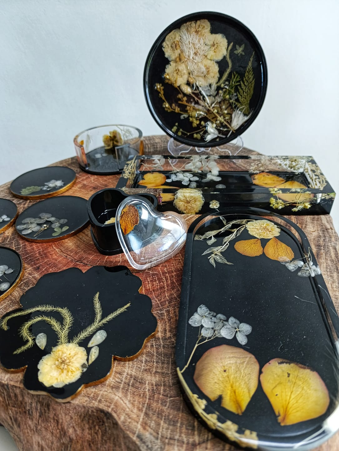 Mistura de Madeira Angelim Pedra com Resina UV e flores do buquê preservadas de acordo com o tipo de flor e folhagem para melhor se adequar as peças do conjunto 10, assim, o conjunto 10 pode ter efeito prensado na resina e 3D destrinchado na resina. O projeto será executado de acordo com o modelo de flor e folhagem em harmonia com as peças do conjunto.