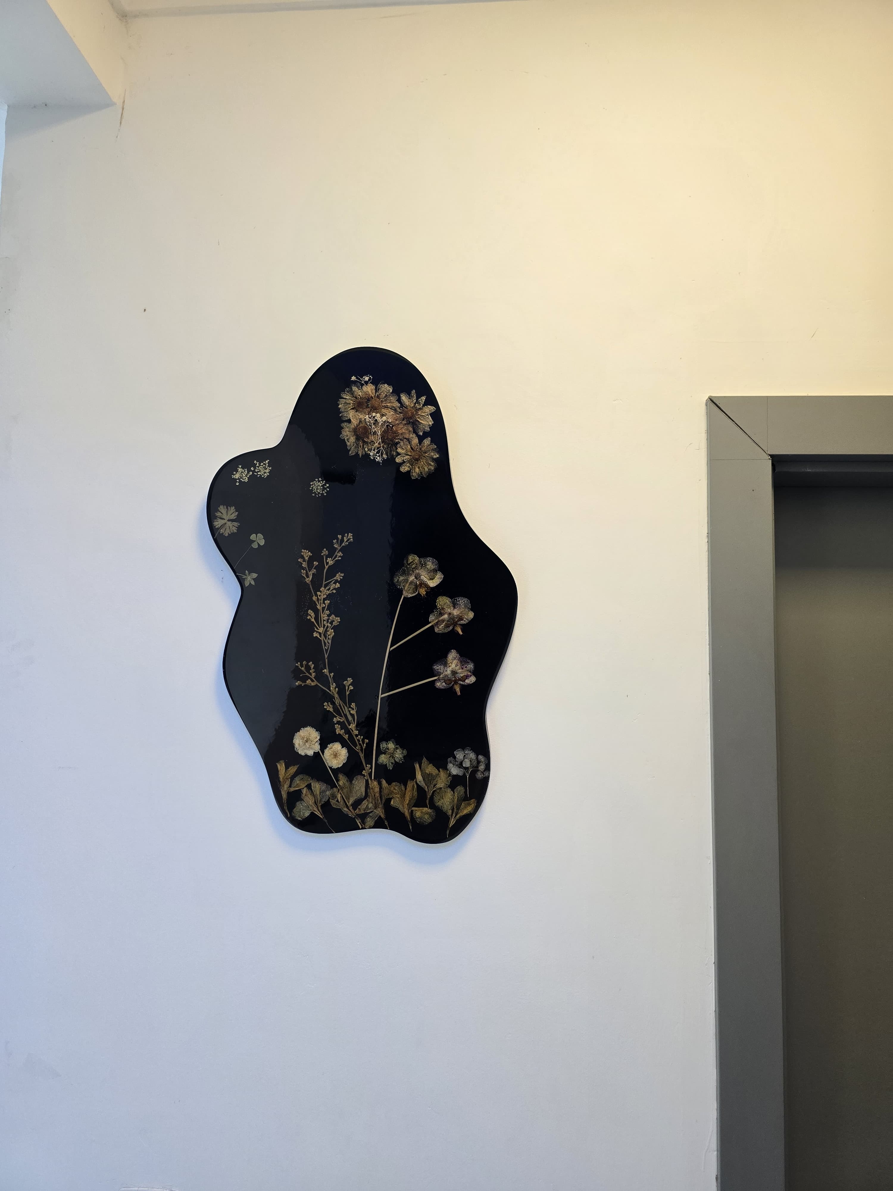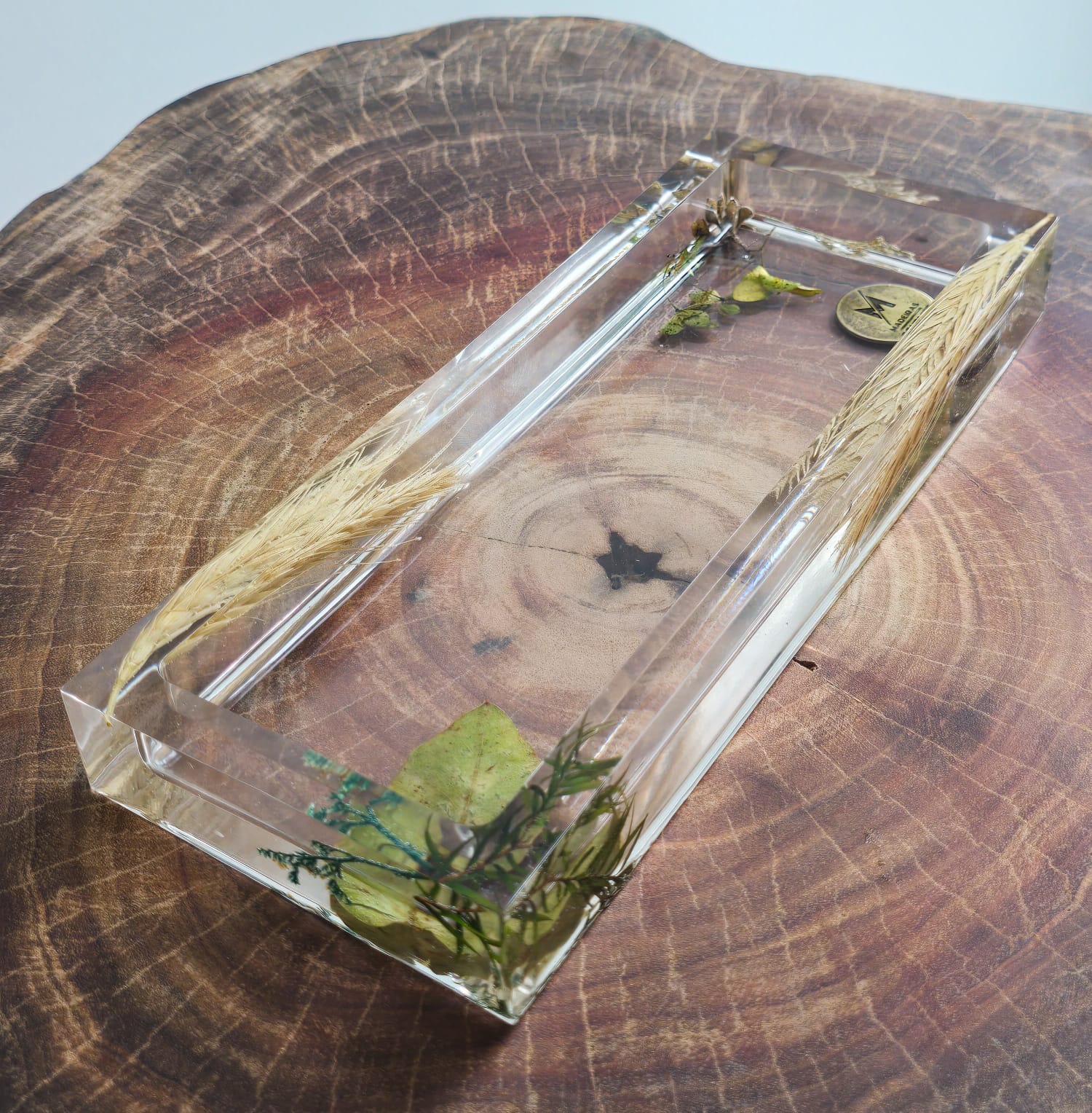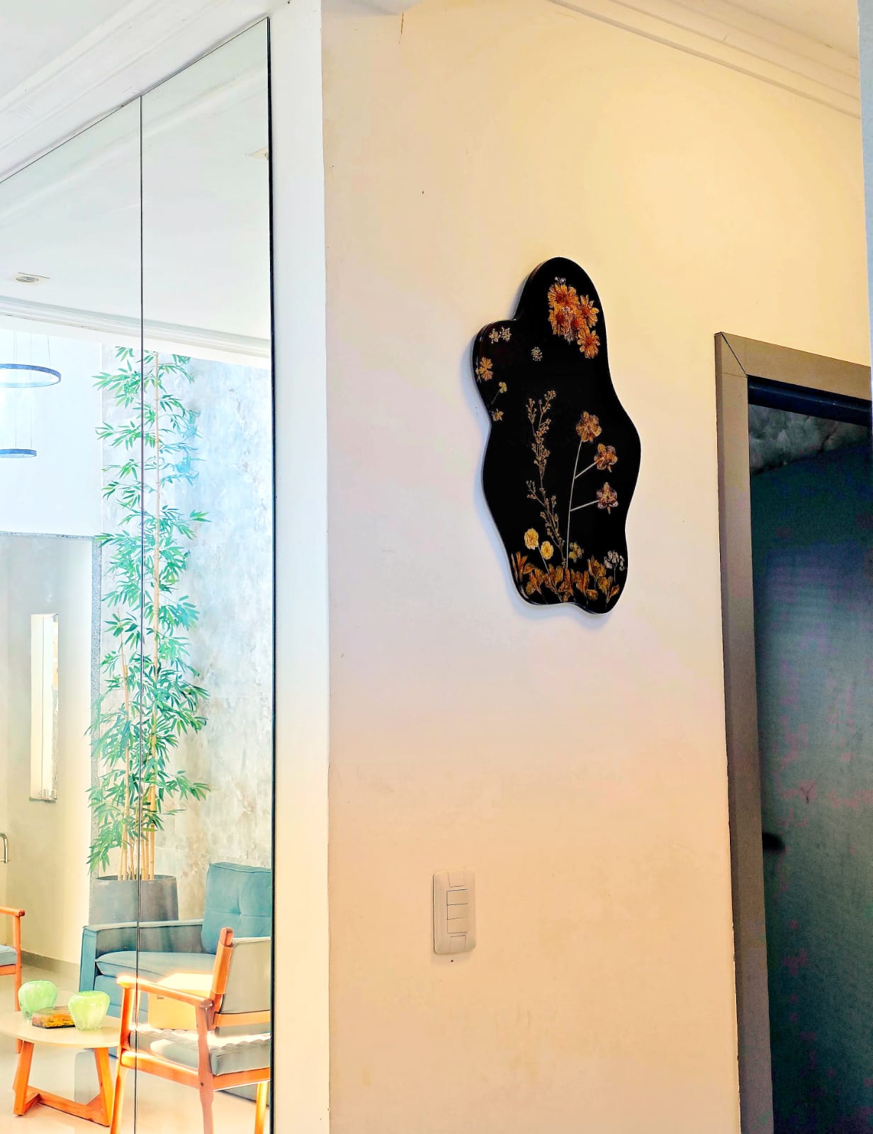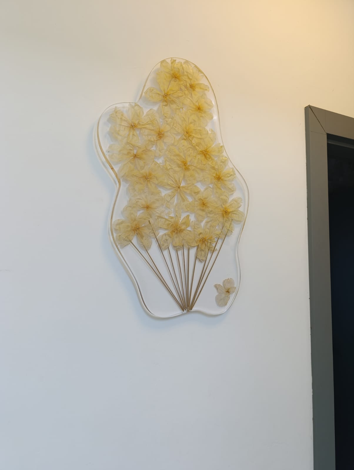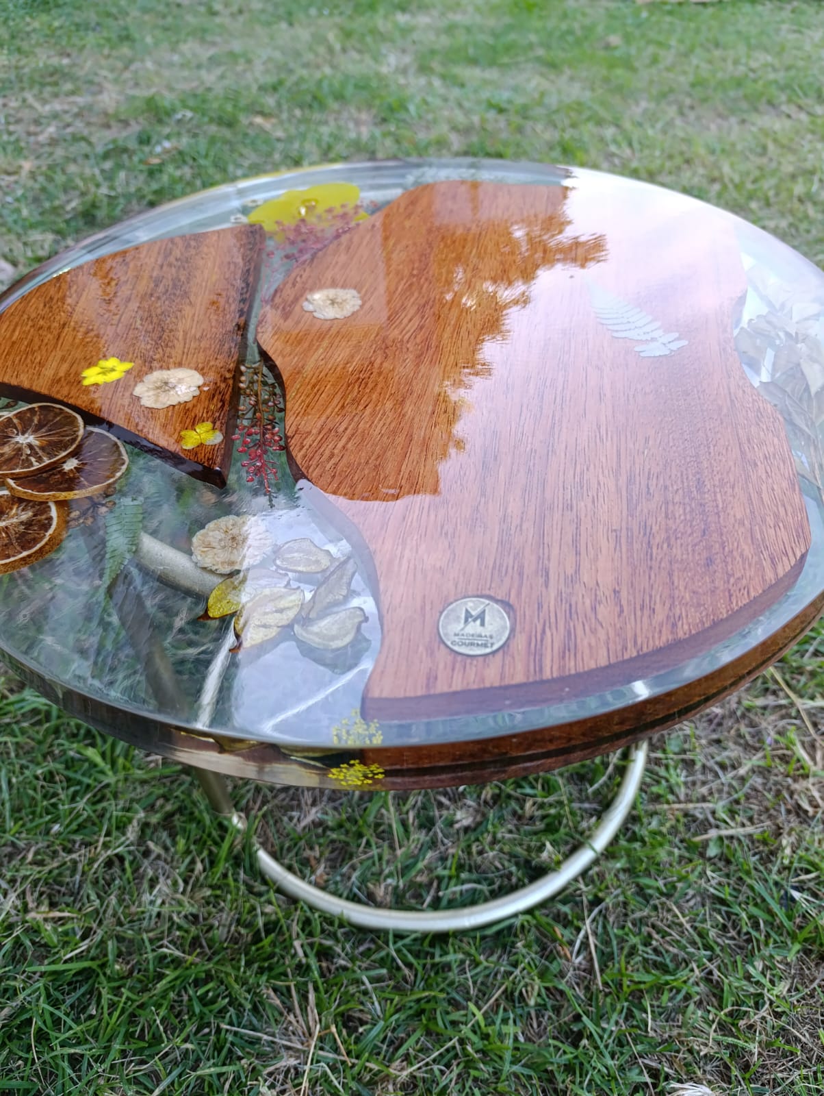 Mistura de Madeira Angelim Pedra com Resina UV e flores do buquê preservadas de acordo com o tipo de flor e folhagem para melhor se adequar as peças do conjunto 10, assim, o conjunto 10 pode ter efeito prensado na resina e 3D destrinchado na resina. O projeto será executado de acordo com o modelo de flor e folhagem em harmonia com as peças do conjunto.