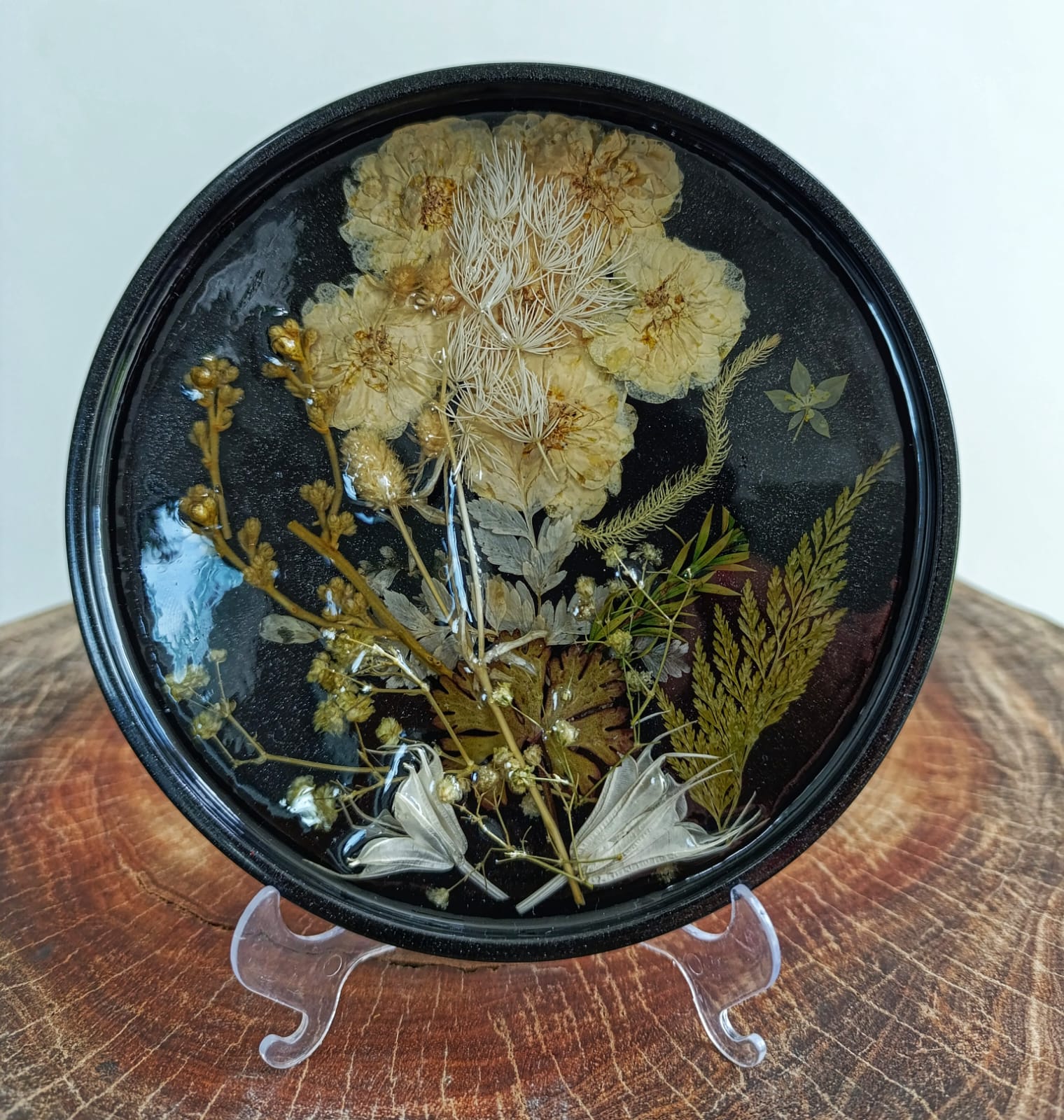 O conjunto 12 é composto com uma tábua de frios de servir com madeira Angelim Pedra, média de diâmetro total 35 cm, com flores e folhagens preservadas do seu buquê.