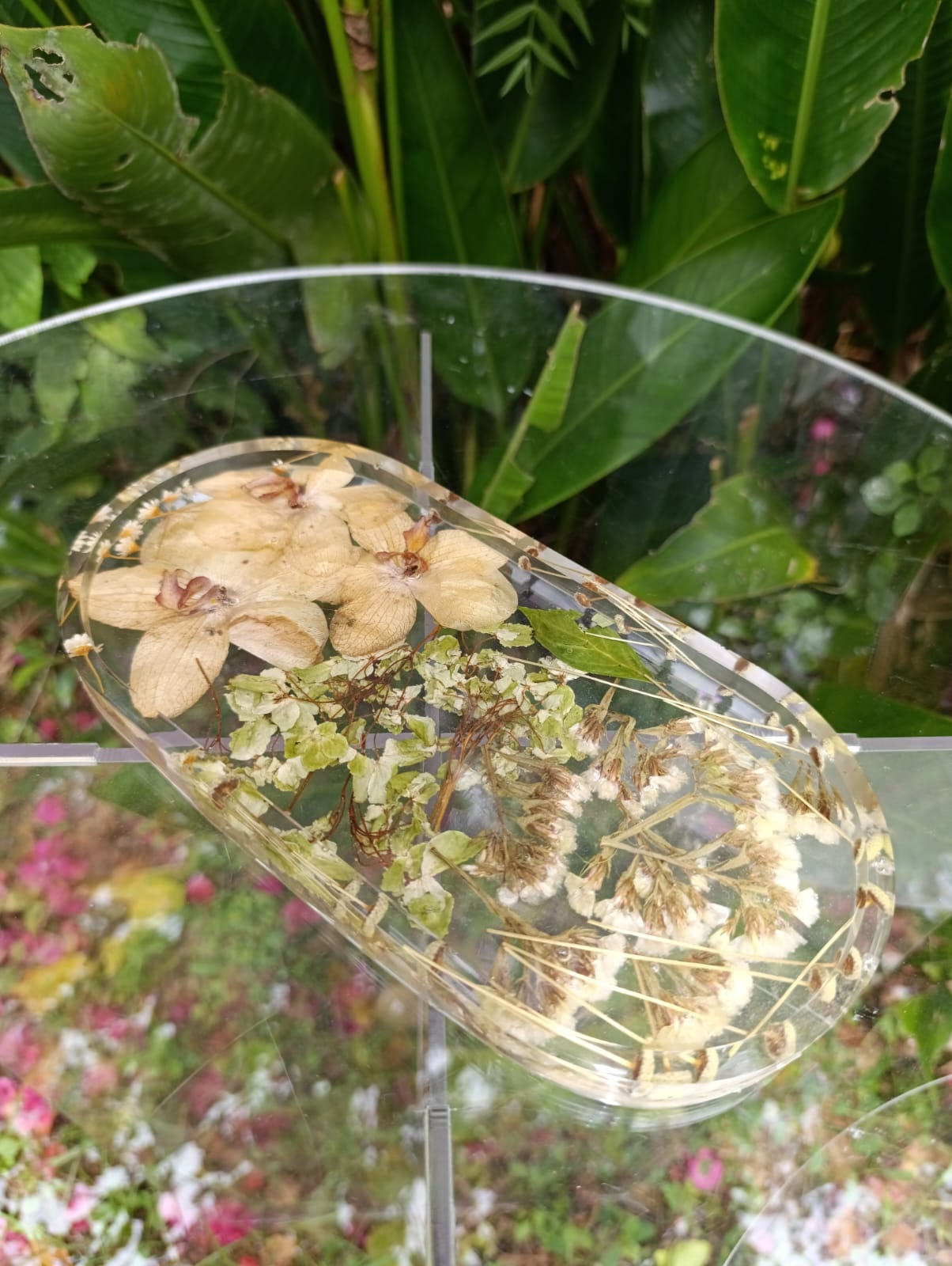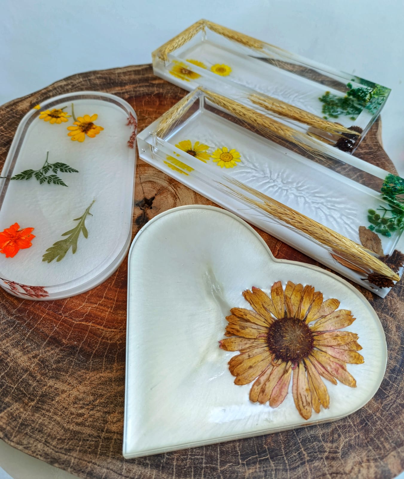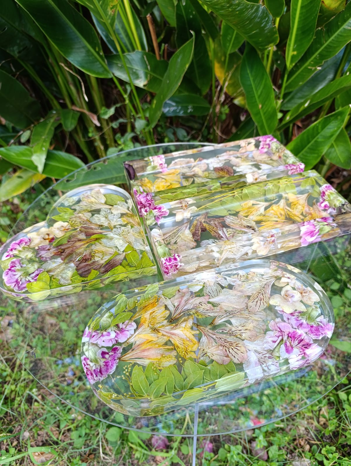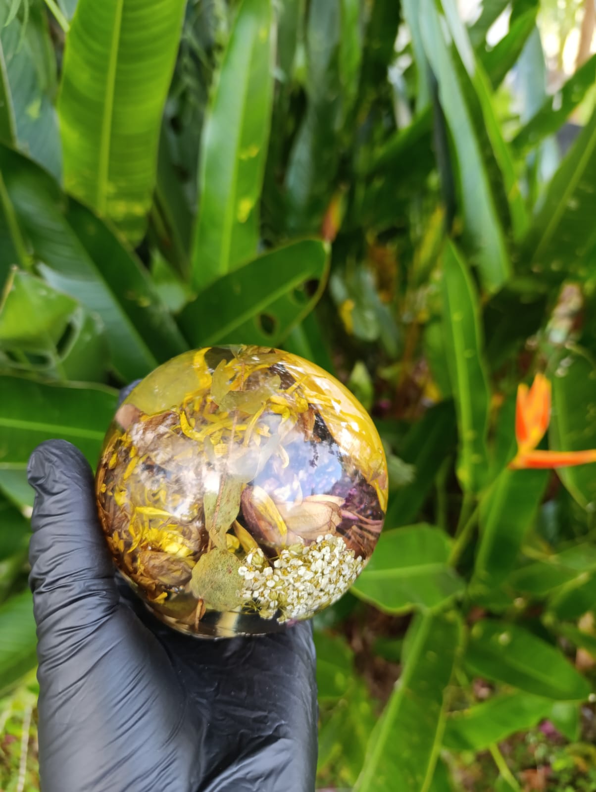 O conjunto 15 é composto de uma esfera que possuí 10 cm de diâmetro um Orgonite floral 11 cm de altura e duas bandejas decorativa e utilitárias.