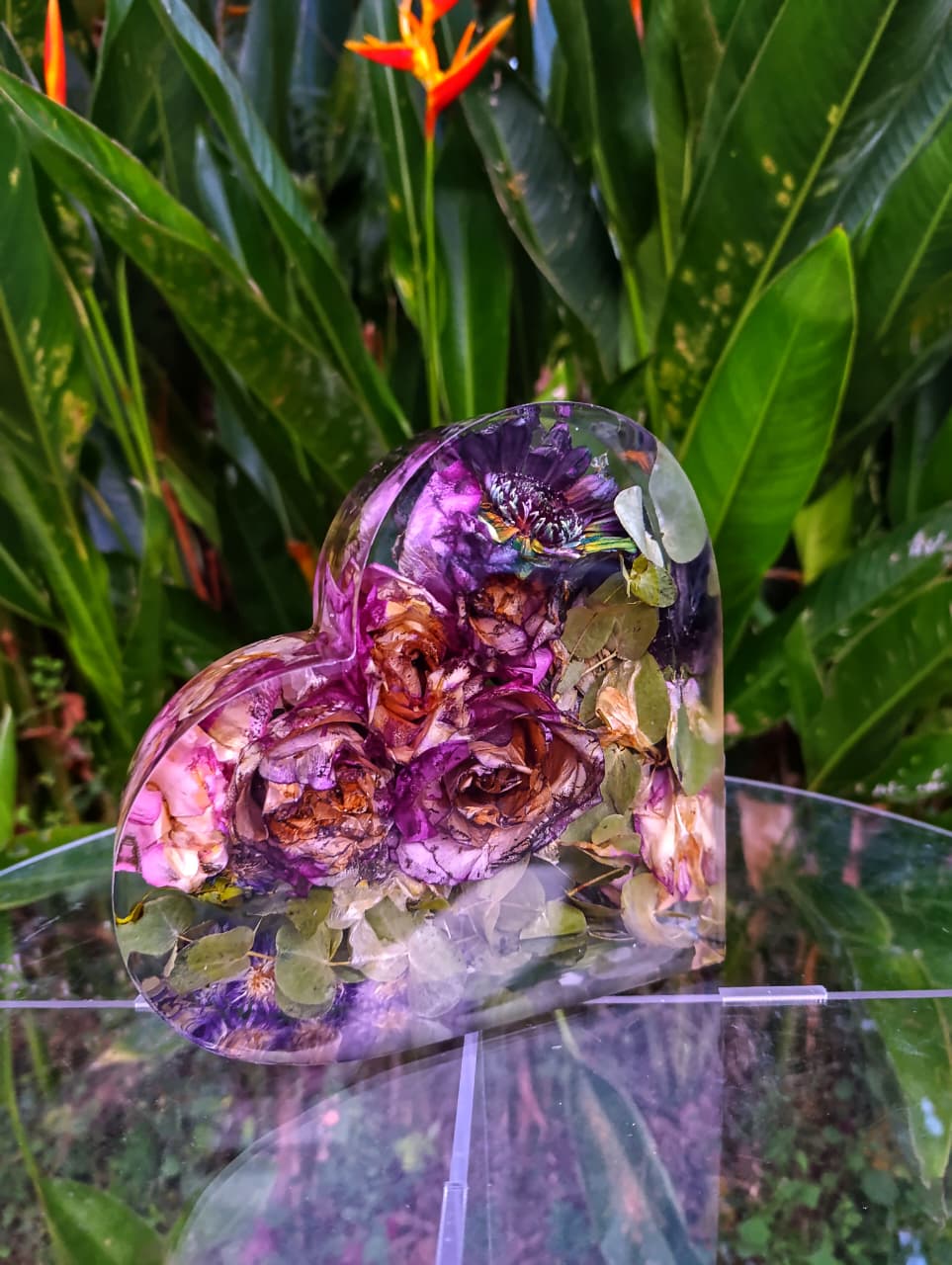 Coração grande com flores e folhagens preservadas do seu buquê mais resina e complementos em madeiras e adornos decorativos.