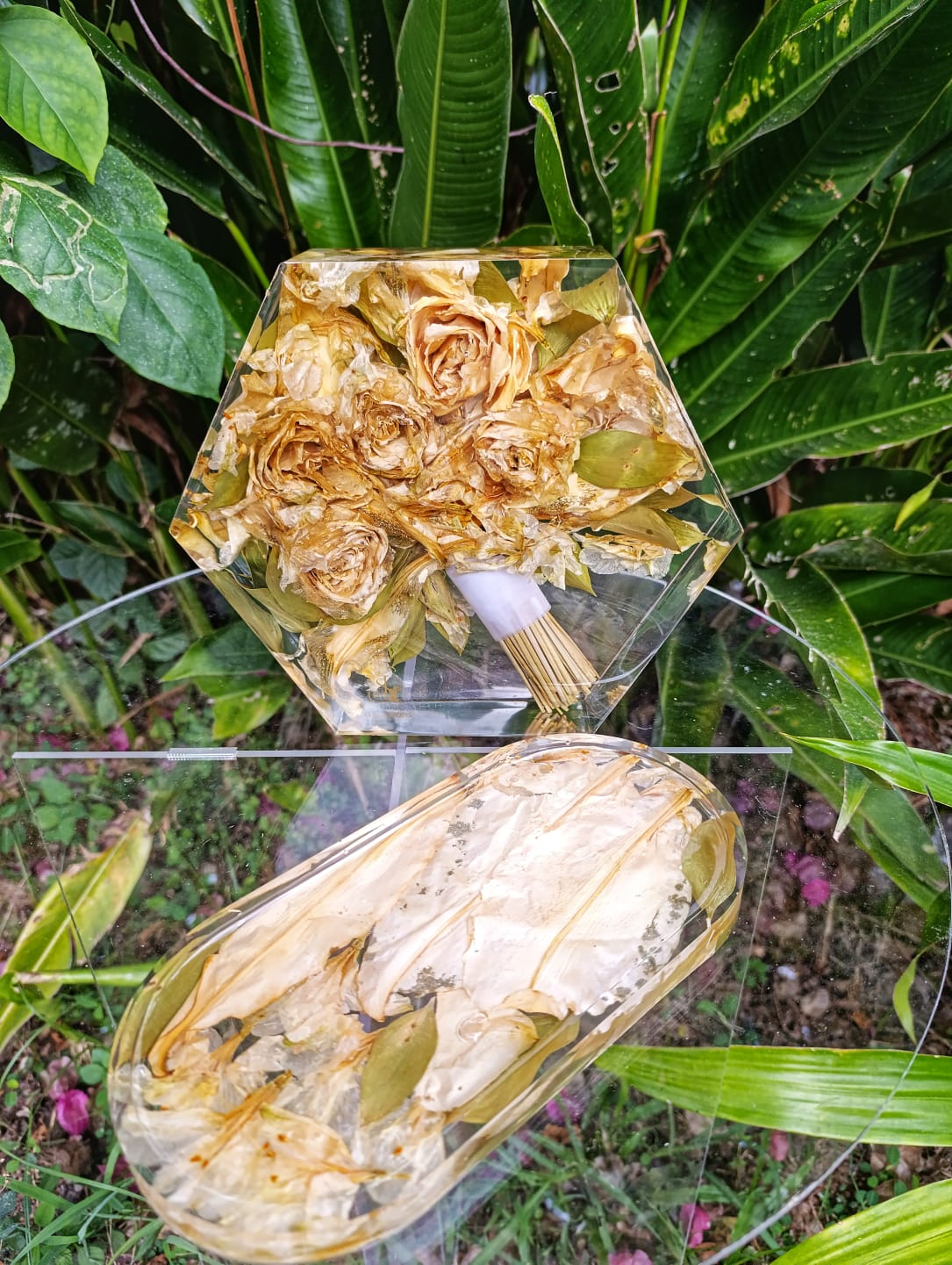 Apenas resina UV e flores do buquê preservadas de acordo com o tipo de flor e folhagem para melhor se adequar as peças do conjunto 11, assim, o conjunto 10 pode ter efeito prensado na resina e 3D destrinchado na resina. O projeto será executado de acordo com o modelo de flor e folhagem em harmonia com as peças do conjunto.