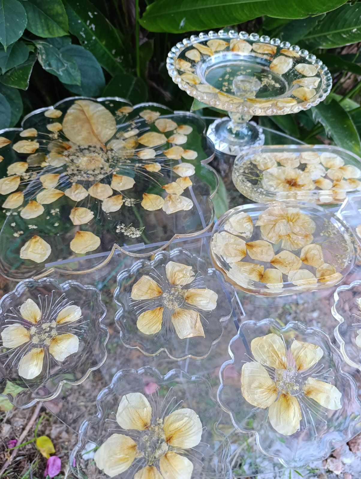 Apenas resina UV e flores do buquê preservadas de acordo com o tipo de flor e folhagem para melhor se adequar as peças do conjunto 11, assim, o conjunto 10 pode ter efeito prensado na resina e 3D destrinchado na resina. O projeto será executado de acordo com o modelo de flor e folhagem em harmonia com as peças do conjunto.
