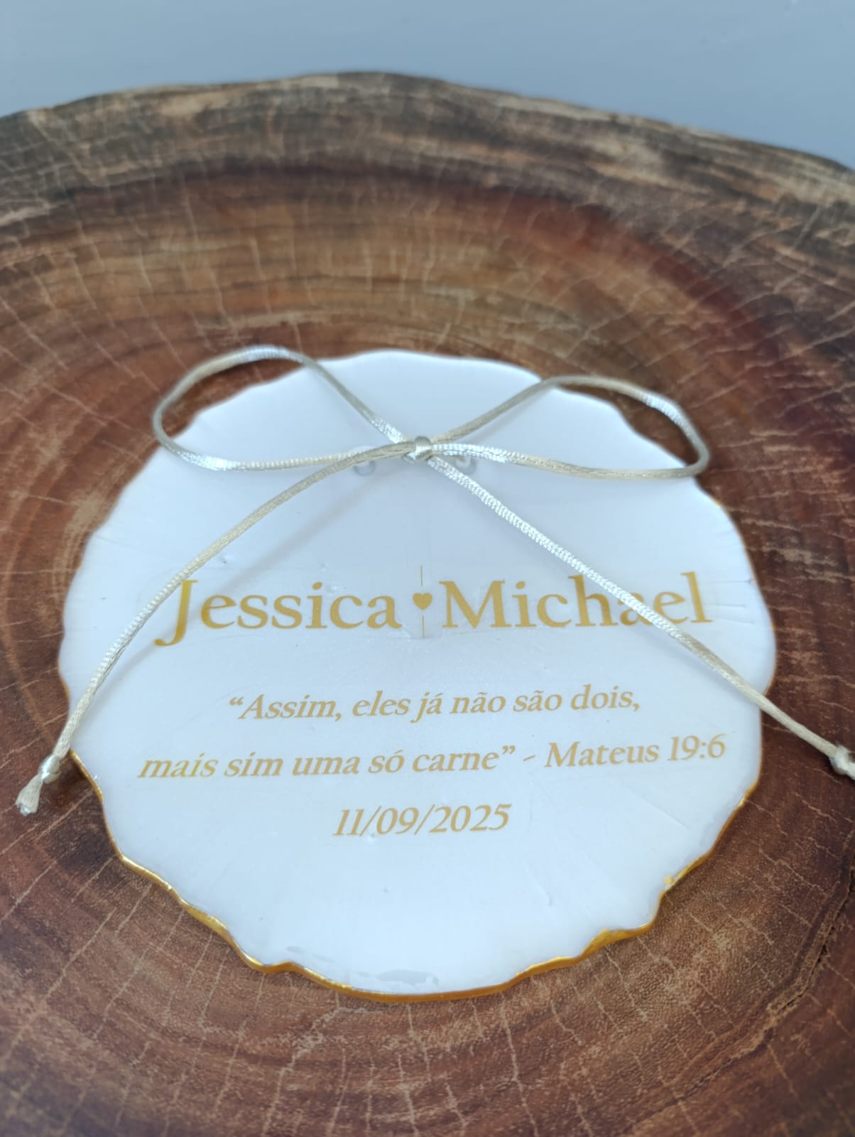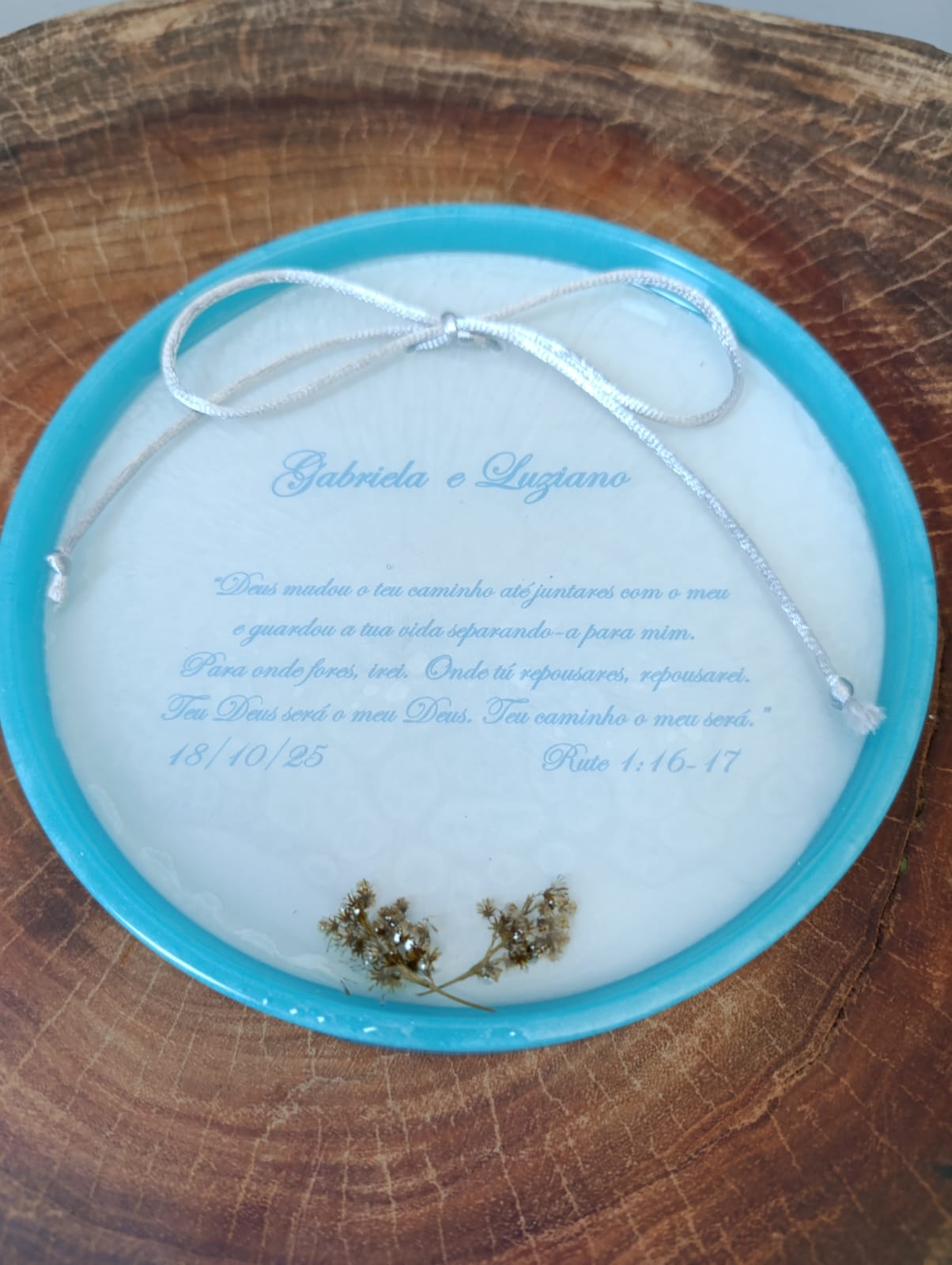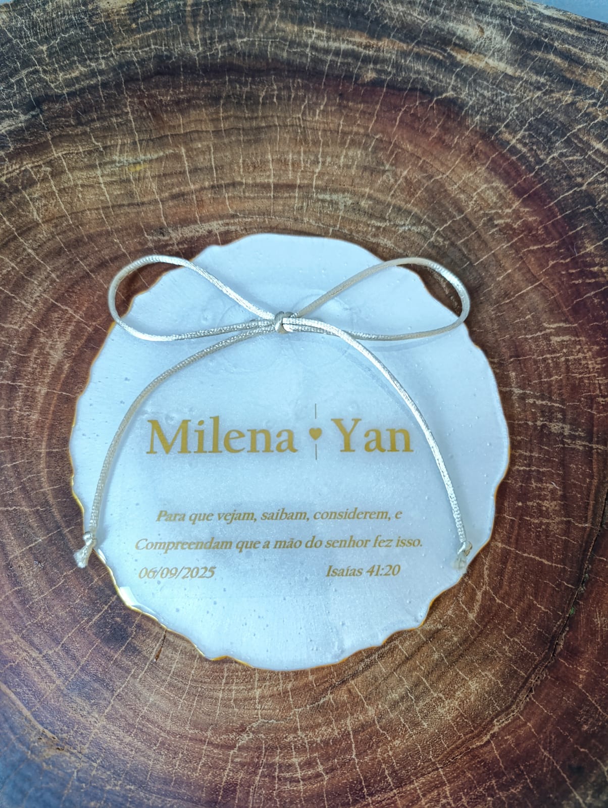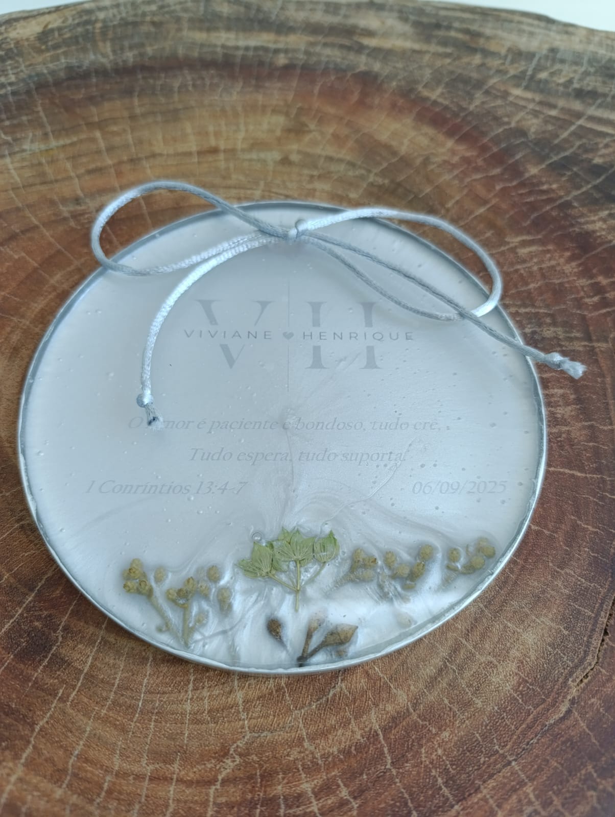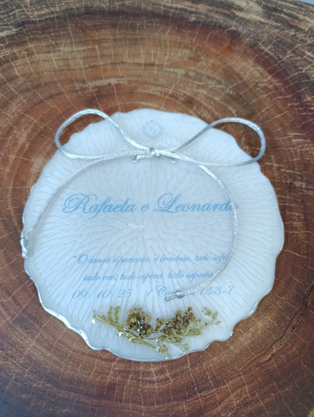 O porta alianças é uma peça em resina de alta transparência personalizada.